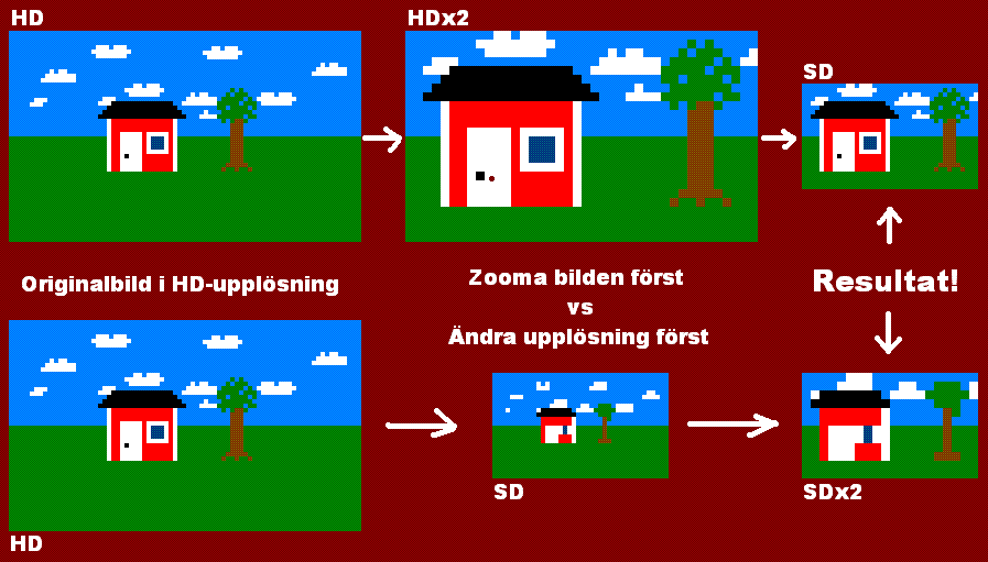 Nu är det nog snarare ni (Rogge & High1ander) som tänker fel i hur pixlarna funkar, eller så har ni (eller jag) missuppfattat frågan. Och jag har hört att en bild säger mer en tusen ord, så därför gjorde jag en lite illustration för att visa vad jag tror Andy P försöker säga. :) Dock vet jag inte om det är på det sättet premiere arbetar när den renderar förstorade hd-klipp i ett hd-projekt till en video-fil med sd-upplösning, då jag aldrig har testat det själv. Fråga om det är nånting som är otydligt med bilden! -