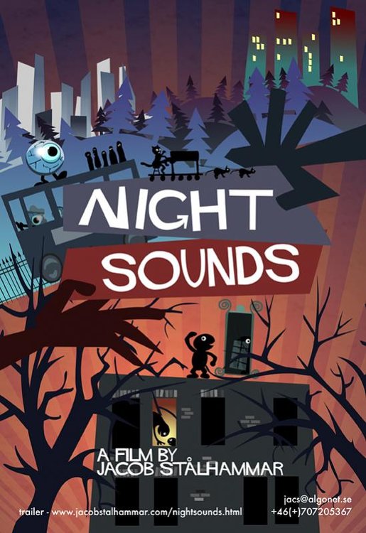 Night Sounds är en liten tecknad kortfilm, en miniskräckis för barn. Inget blod, inget våld, bara glada fladdermöss, kuslig musik, märkliga ljud, och en nyfiken krabat på mystisk promenad... Eller som GIFF skriver i sitt program "Det är natt och dags att sova, men monstren under sängen vägrar vara stilla och den hysteriskt pianospelande katten vägrar vara tyst och därpå kommer ett springande öga. En absurdistisk skräckanimation för de minsta." Dom skriver ju bättre än mig så varför inte citera. :D Alltsammans (film, musik, klipp, teckning, animation, historia) är tillverkat av mig (och med god ljudhjälp från FREESOUND, fantastisk site, tonvis med ljud, allt från effekt till ambiens till loopar... ). Night Sounds får världspremiär på Göteborgs Internationella Film Festival 2011-01-28 19:30 och här är TRAILER SIDORNA