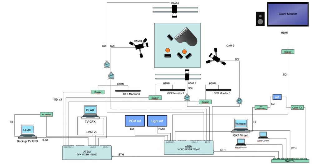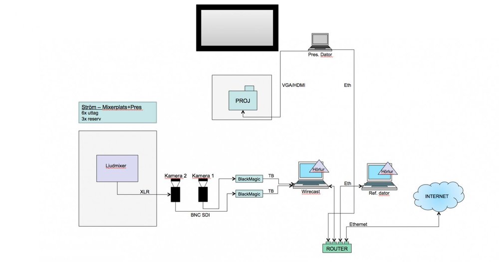 Grymt kul att få köpa en ny mixer. Roland gör bra saker och jag har kört den du pekar på en gång på ett jobb i Warszawa av alla ställen. Dock inte med ljudkontrollen. Så vågar inte säga så mycket om den mer än att den gjorde sitt jobb då. Det är ganska trevligt med inbyggd monitor, även om jag inte skulle våga använda den för ref. av bild. Jag vågar inte svara på om Roland har egna program för streaming, jag tror inte det. Utan det du ska se till att få till är en bra väg för streaming. Antingen via USB3 till en dator som har ett program för streaming. Där finns ju de alternativ som nämnts innan. Eller SDI/HDMI ut till ett videokort eller en dedikerad streaming/encoder-pryl, t.ex. Teradek VidiU/Cube eller liknande. Eller Wirecast med stora möjligheter med både streaming och inspelning samt att kunna lägga grafik osv. Eller kanske köra OBS, som kan mycket och kostar inget. När jag kör hårdvarumixer har jag antingen en Wirecast för streaming och x264-inspelning via en Ultrastudio MiniRecorder, eller SDI rakt in i en Teradek Cube. Jag håller på att utvärdera om OBS är ett alternativ för oss i vissa situationer. Än så länge ser det det mycket intressant ut, främst inom inspelning och streaming. Jag visar en skiss till när vi kör lite mer avancerat. Det är en skiss på videoflödet i en livesändning vi gjorde med Darin, med inslag av separat interaktiv grafik vilket då krävde två bildmixar, eller det blev lättare och säkrare att jobba med 2st än en och/eller bara datorer. Här användes Wirecast i slutändan av kedjan till vinjetter och komprimerad x264-inspelning som backup mot den högupplösta Prores-inspelningen i ATEM-mixern. Slänger in en teknikporrbild också bara för det är najs. Min ref. dator är som du säger bl.a. för att ha koll på hur streaming/sändningen ser ut från tittarens perspektiv, men det finns fler anledningar. - Kör vi t.ex. Wirecast är det inte bra att köra referens-titt på samma dator då det äter CPU, som jag vill lägga på inspelning och streaming. Dessutom vill man ju kunna klicka omkring, kolla på statistik och bara se och höra hur det låter i sändning. Det händer ju faktiskt lite på vägen, både med ljus och ljud, och man kan inte snöa in sig på att det ser bra ut i sändningsdatorn. - Ibland blir det även problem med streaming-leverantören och då får man snabbt möjlighet att hantera/granska det utan att man pillar på sändningsdatorn som kanske inte kan streama, men den kan fortfarande spela in. - Utöver det så kör vi ibland remote-desktop mot presentationsdatorn, där vi kan sköta/byta presentationer bekvämt utan att springa fram. Det uppskattas ofta i sammanhang med flera presentatörer som inte är så tekniska eller nervösa över deras föreläsning som de helst ska lägga fokus på. - En fjärde sak med ref-datorn är helt enkelt som en backup om det värsta händer och sändningsdatorn går sönder av någon anledning. Det är mycket som kan hända och är man på resande fot kan man inte rusa till kontoret och hämta en ny dator. Så en ref.dator bra till många saker, och mer eller mindre alltid standard på de flesta produktioner.