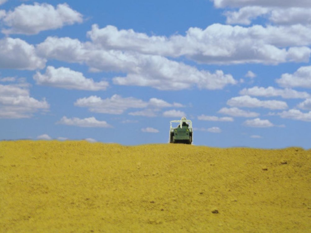Jag tackar så mycket för hjälpen! Jag blev väldigt inspirerad av Quantums bild. Men det känns ändå inte riktigt "mitt" att använda andras bilder. Därför kommer jag göra ett försök att skapa berg själv genom att göra jordhögar med stenar på. Lägger upp resultatet när jag är färdig. Har dock en annan bild att visa upp. Vad tycker ni om den? Det ska föreställa en liten kulle som utgör horisonten mot himlen. Ser det dåligt ut? (Bortse från bilen.) Undrar också vilken effekt jag ska använda för att skapa det ljuset som Quantums la till på min bild. Testade med curves med fick det inte till det så bra.