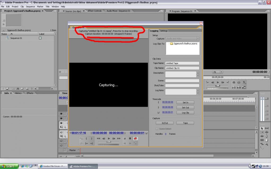 Hej... Sitter och försöker fånga materialet från bandet i Premiere pro 2.0, men det går inte .. Har filmat med en Canon XH A1 med dv band och i Dv lägge & i 16:9, fast när det kommer fram till att captura så står det i capturrutan att "0 framms dropping" Nån som vet vad det kan beror på? Tacksam för svar