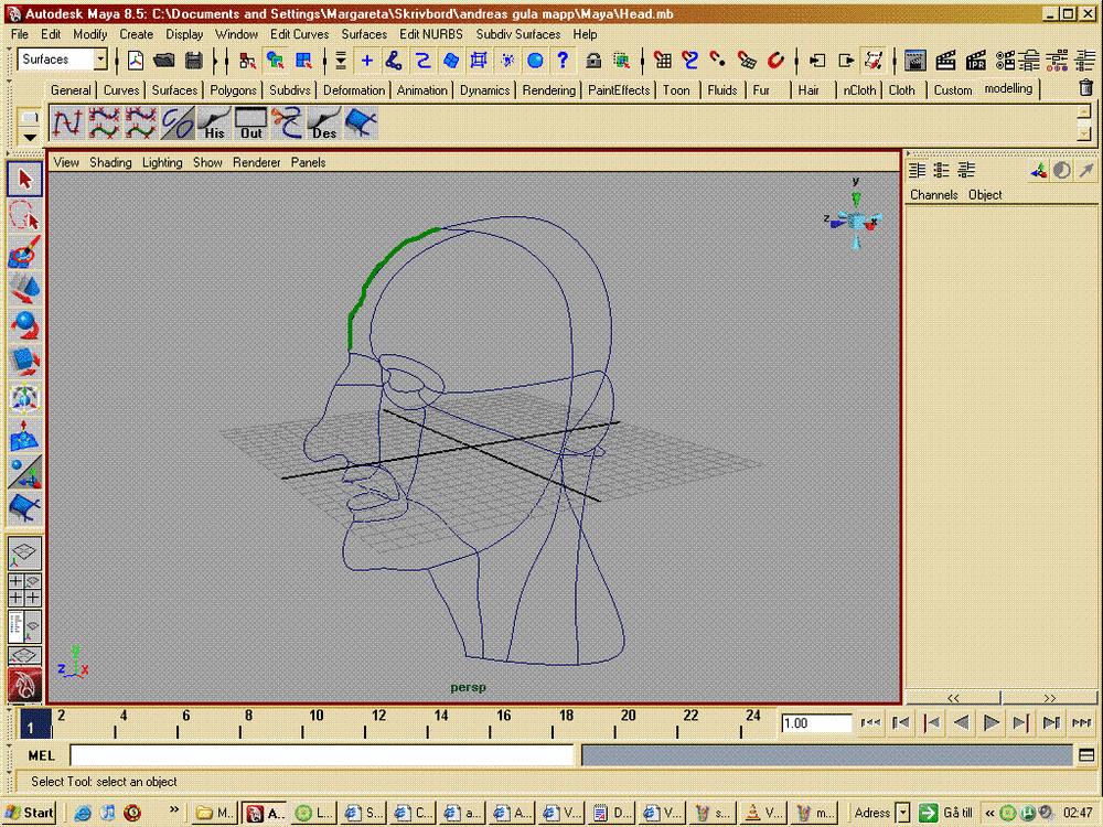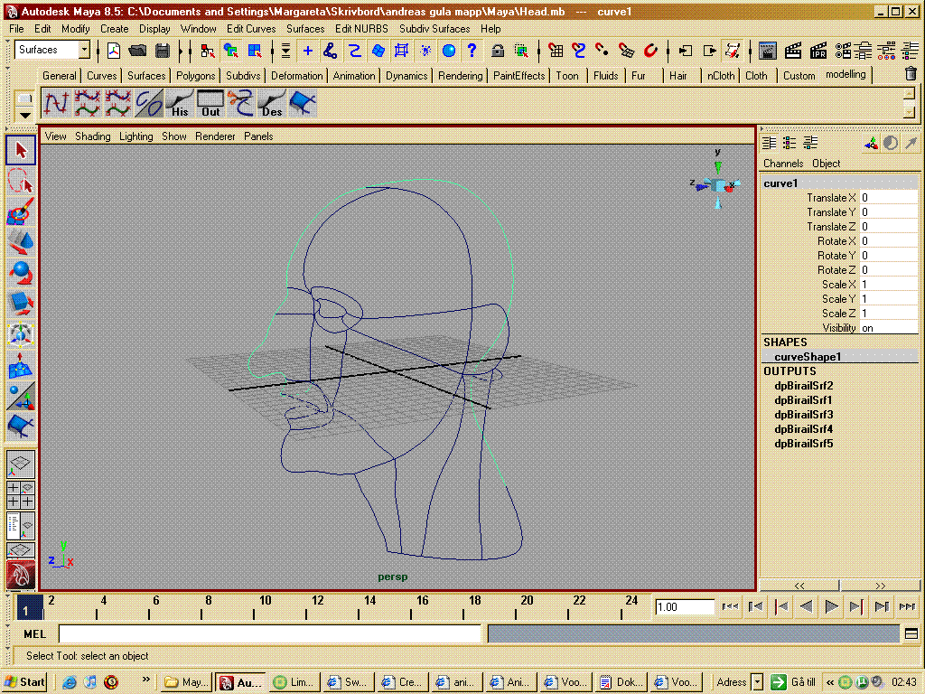 Hej, Jag har nyligen börjat arbeta med Maya som grön nybörjare i 3d. Nu sitter jag och följer en videotutorial där man lär sej göra ett huvud, men är fast. Killen i videon använder Maya 6, jag har 8.5 unlimited. Jag har ritat upp alla mina curves och det är nu dags att börja med surfaces. Men här hoppar killen i videon en bit i förväg och när han börjar lägga dit surfaces mellan sina curves har han redan delat upp kurvorna. T.ex. Kurvan som, i profil, går från överläppen till nacken är för mej en ända lång kurva. Men han har delat den så den del som löper över pannan tillsammans med 3 andra kurvor bildar en rektangel. Mellan dessa fyra kurvor bildar han sedan en surface med Birail 2 verktyget. Det går ju dock inte för min del, då jag sitter med en jättekurva som inte vill vara del av någon rektangel. Jag har försökt dela denna kurva genom att använda "curve points" och sedan Detach Curves, även om kurvorna tillsynes bildar samma rektangel som han går det inte att lägga någon surface mellan dom. Får ursäkta de dåliga bilderna. http://forum.voodoofilm.org/attachment.php?attachmentid=2412&stc=1&d=1187311831 Så här ser min långa kurva ut http://forum.voodoofilm.org/attachment.php?attachmentid=2413&stc=1&d=1187311838 Det här är hans korta kurva (fick fylla i med grönt i paint då min printscreen från VLCspelaren inte funkade) http://forum.voodoofilm.org/attachment.php?attachmentid=2414&stc=1&d=1187311844 Mellan denna och tre andra kurvor bildar han sedan en surface, något som jag då inte kan göra efter som min inte är uppdelad. Är mycket tacksam för all hjälp och rådgivning.