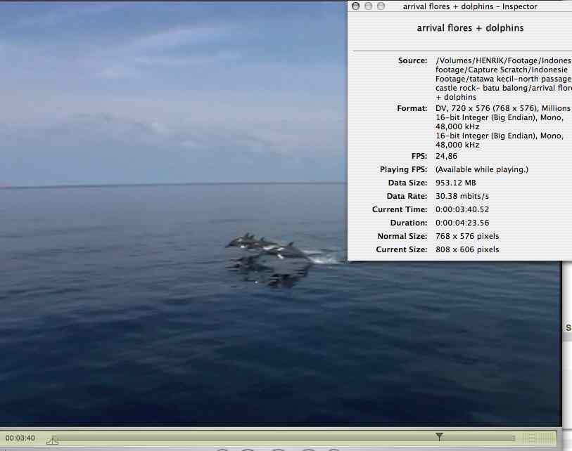 Hej! Okej. Jag provade att öppna en av filerna som jag ännu inte döpt om. Jag valde den filen därför att den har en 'oregelbunden' storlek - 1,67gb - jämfört mot alla andra filerna, som ligger på 2gb, 800kb eller 64kb och som verkar vara avkomman av en capture som gått fel.. Denna filen gick som dom andra inte att öppna. Därför kan jag inte utläsa någon info från den i QT. Tycker det är konstigt att några av filerna fungerar fint från början. Till exempel den med delfinerna som jag bifogar bild på, medan alla andra filer i samma mapp inte funkar. Kameran som användes för att filma och capture med tror jag var en SONY DCR-HC96E. Bifogar QT info från fil som funkar, fil som är omdöpt och därmed går att öppna, samt den info som gick att få från film som inte funkar att öppna men som verkar vara en faktiskt film pga av dess storlek. Mvh Henrik -